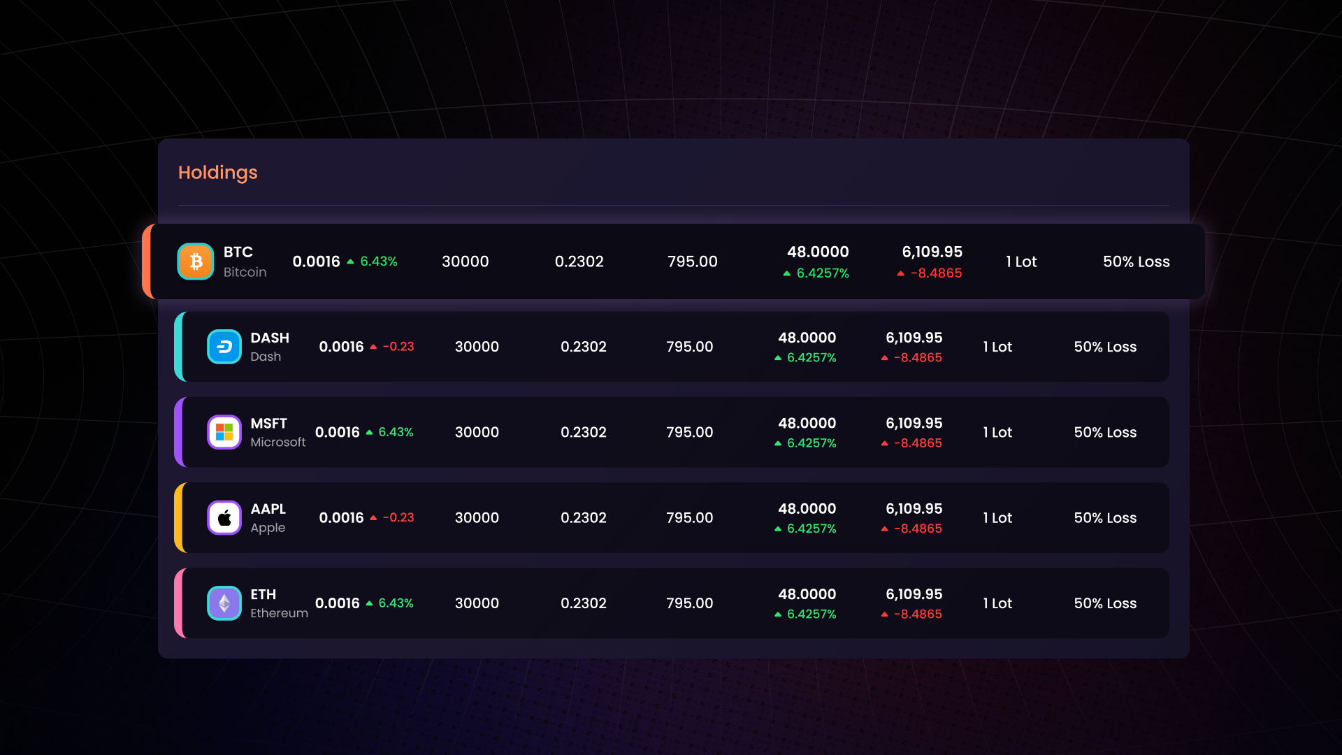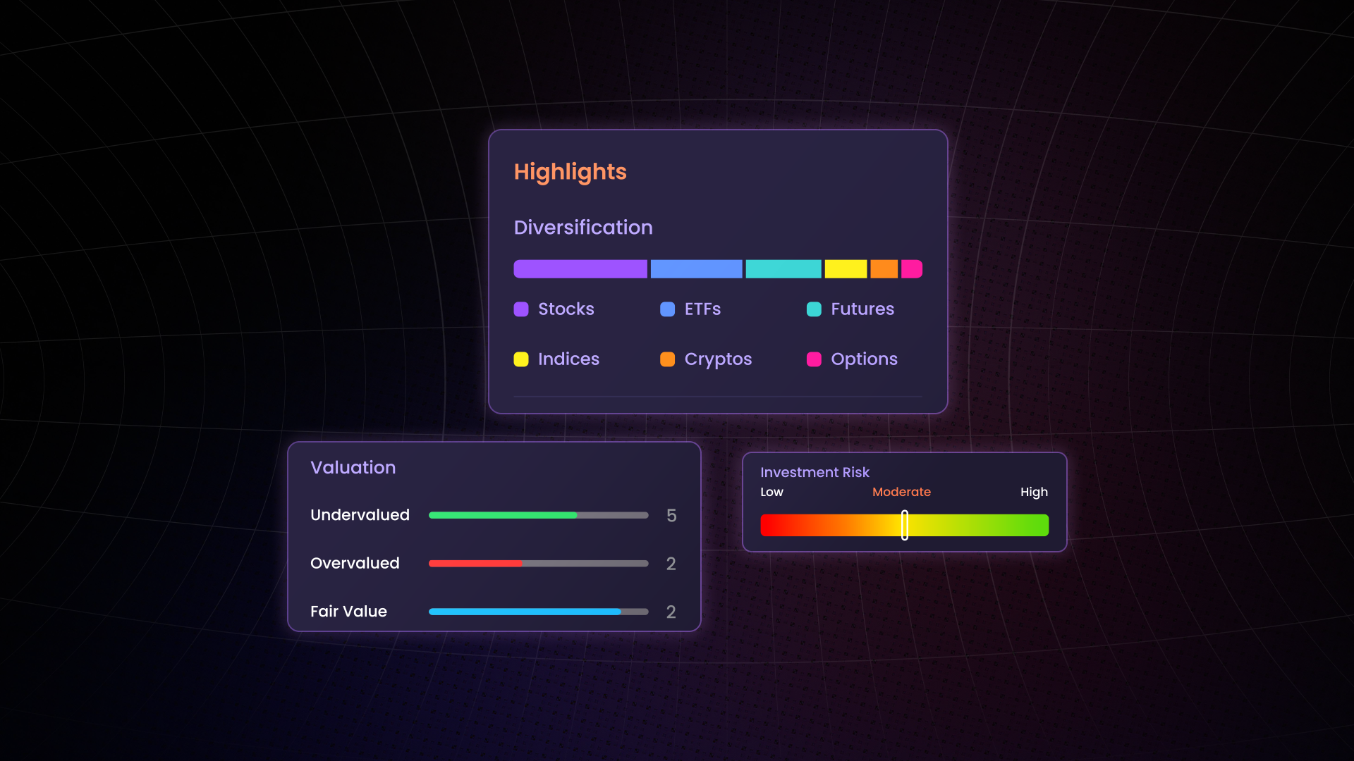 Visualize holdings by asset class (stocks, crypto, ETFs, indices, options, futures, NFTs)